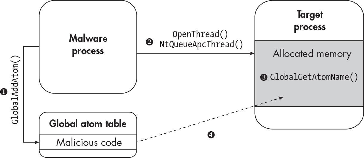 NtQueueApcThreadto force the process to do step 3. - get the Atom with