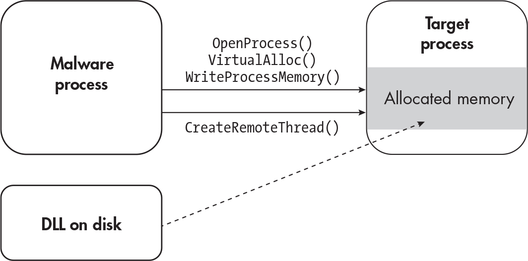 VirtualAlloc,VirtualAllocEx, orNtAllocateVirtualMemoryto allocate enough memory. WriteProcessMemoryorNtWriteVirtualMemoryto write the location of the DLL.- Call