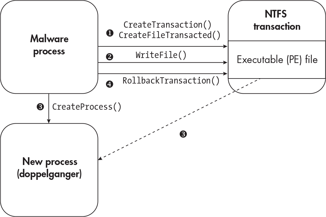 CreateTransactionis called and open an existing executable file withCreateFileTransactedor use lower level functions likeZwCreateTransaction,RtlSetCurrentTransaction, orZwCreateFile- write to a file with