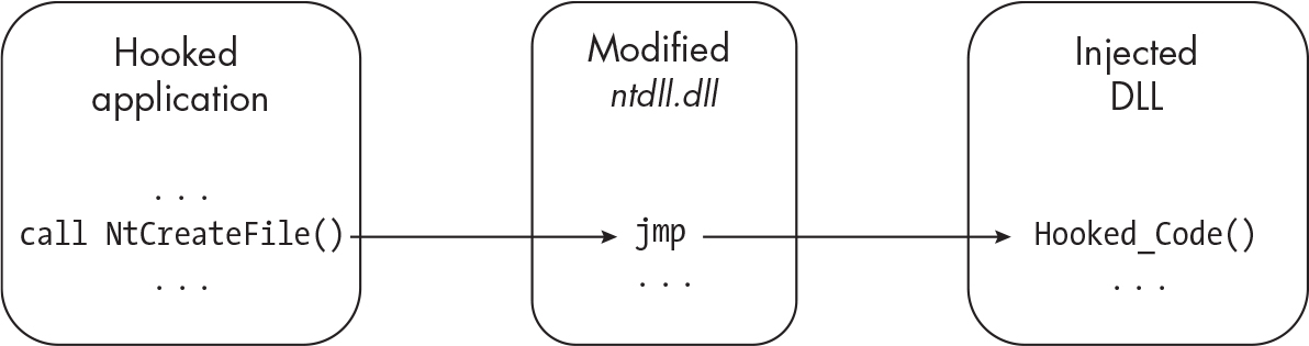- Injects code into a target process and modifies the function being hooked.