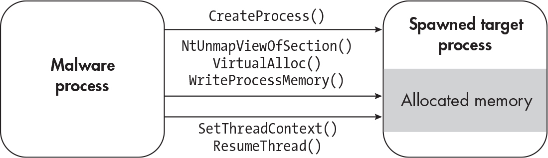 CreateProcess(CreateProcessAorCreateProcessW) with the flagCREATE_SUSPENDEDor0x00000004 - Unmap the process’s code with