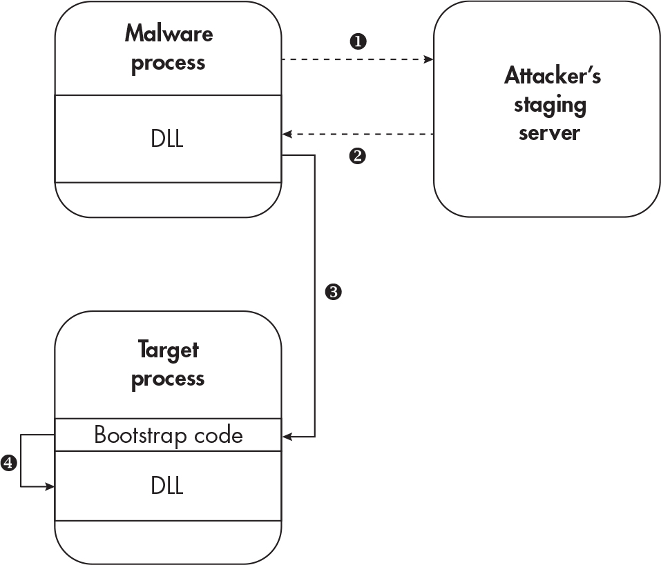 - Write the DLL to the memory and transfer the control flow into the new injected DLL.